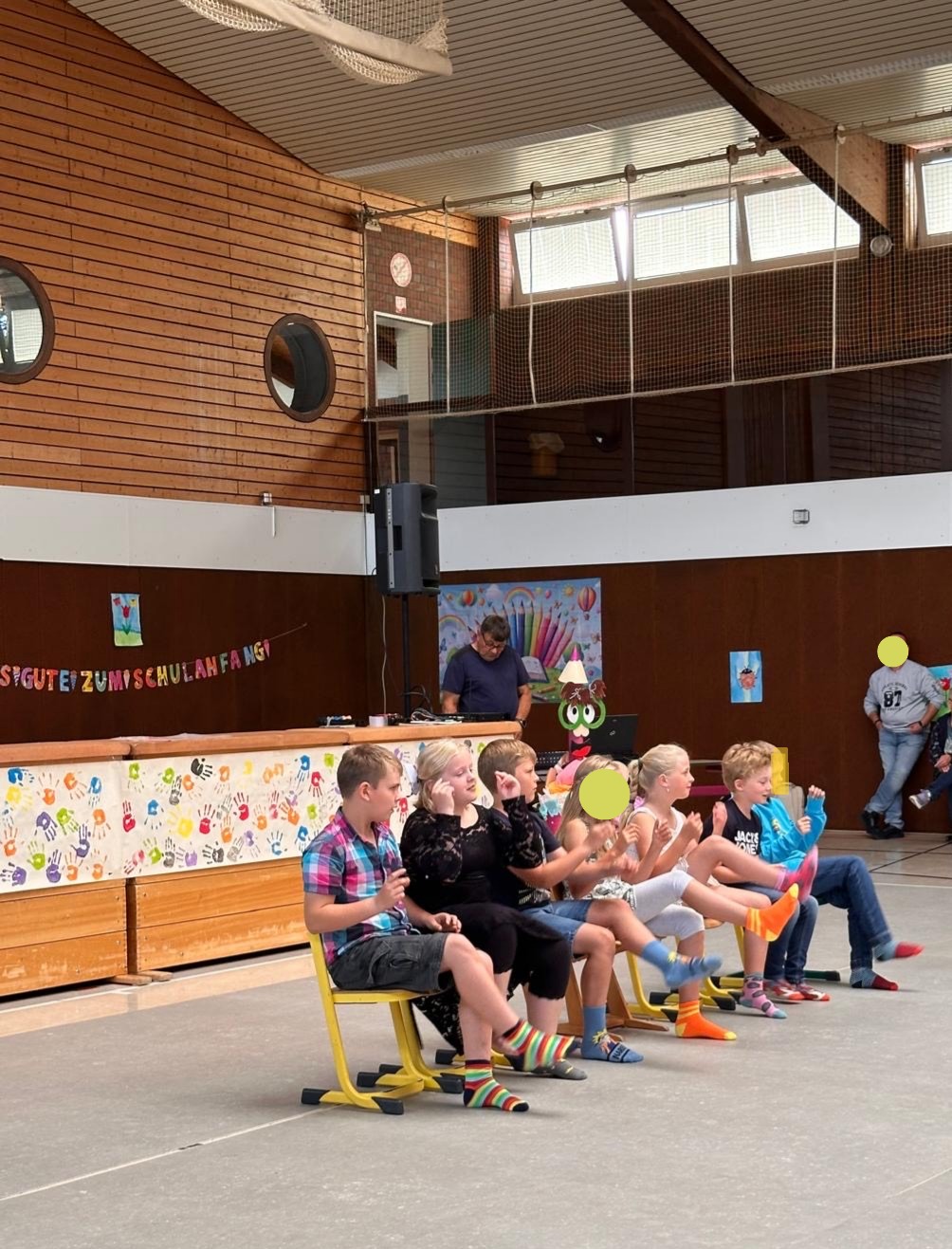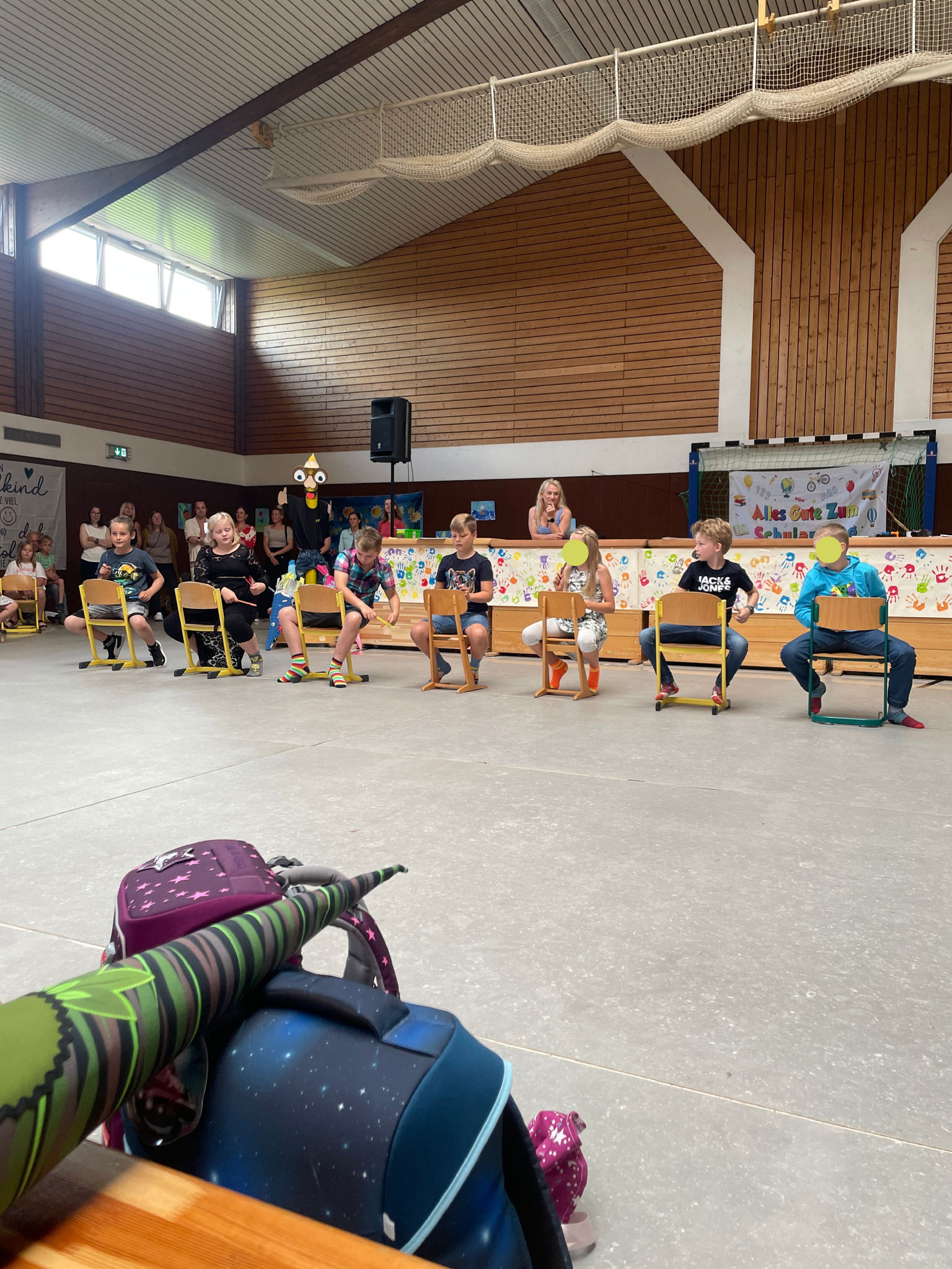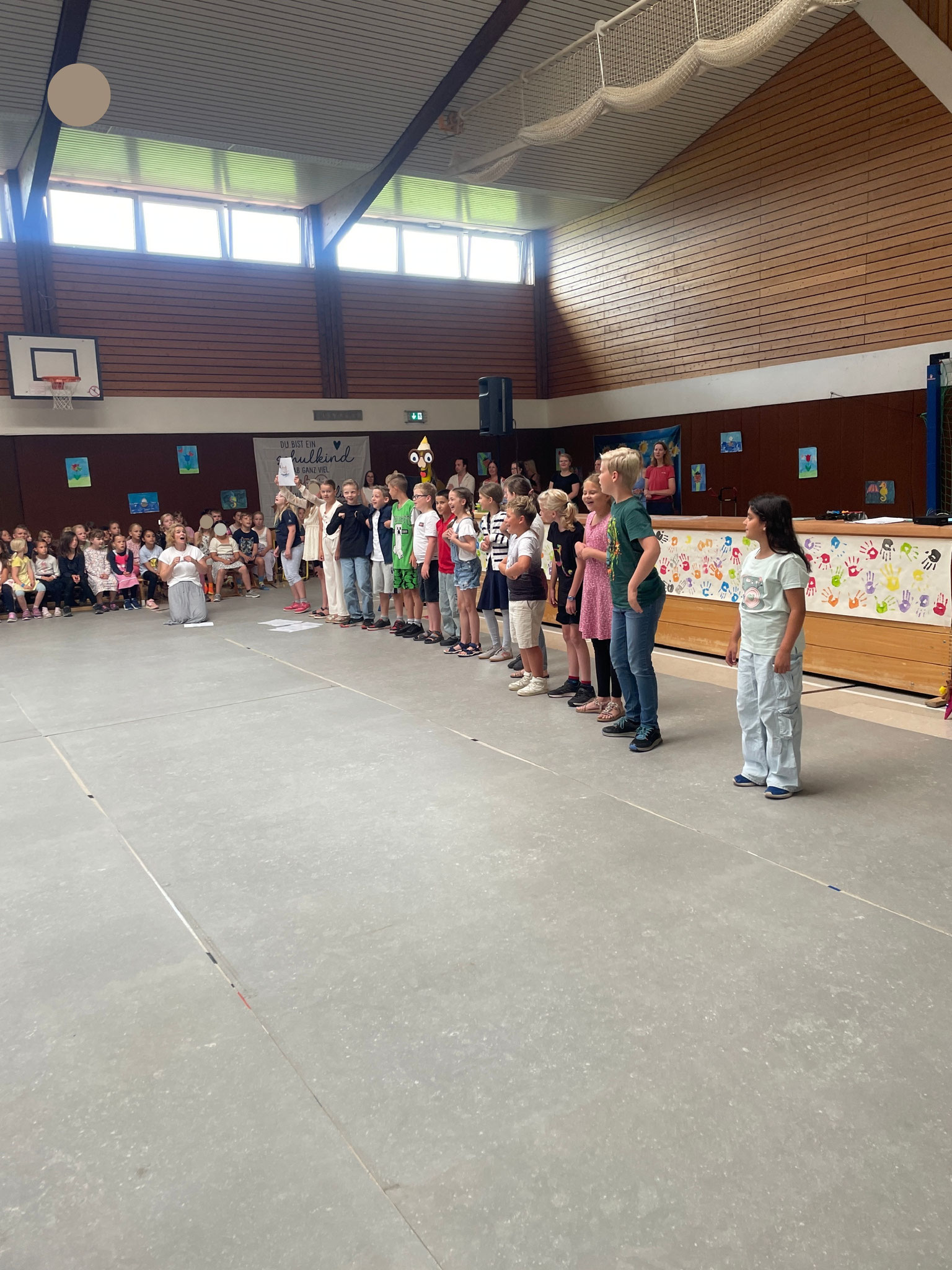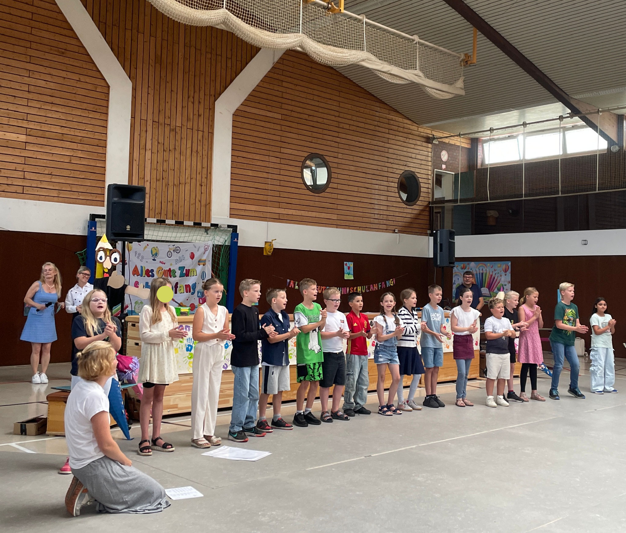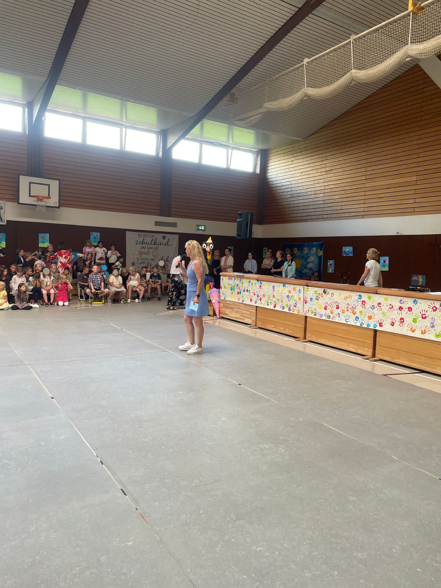Das Beginn des neuen Schuljahres stand vor der Tür und mit diesem brachten die neuen Erstklässler frischen Wind in unser Schulhaus! Zur Einschulung am Samstag, 10.08. trafen zahlreiche Kinder mit Ihren Familien und Angehörigen ein, um zu feiern, dass sie jetzt Schulkinder sind. Dazu fand in unserer Turnhalle ein buntes Programm statt. Zunächste stellte sich Frau Lorenz, unsere neue Schulleitung, vor und leutete den Vormittag mit einer Rede ein. Daraufhin präsentierten unsere Viertklässler aus der Sonnenblumen- und Rosenklasse ein Theaterstück, Sketche und einige Musikstücke, welche sie zuvor mit Frau Lübbers eingeübt hatten. Auch Frau Goebel gab einen Einblick in die Yoga-AG, die jeden Montag im Ganztag stattfindet. Frau Broer moderierte das Programm. Hinter den Kulissen organisierte unser Hausmeister Theo den Auf- und Abbau sowie die Technik.