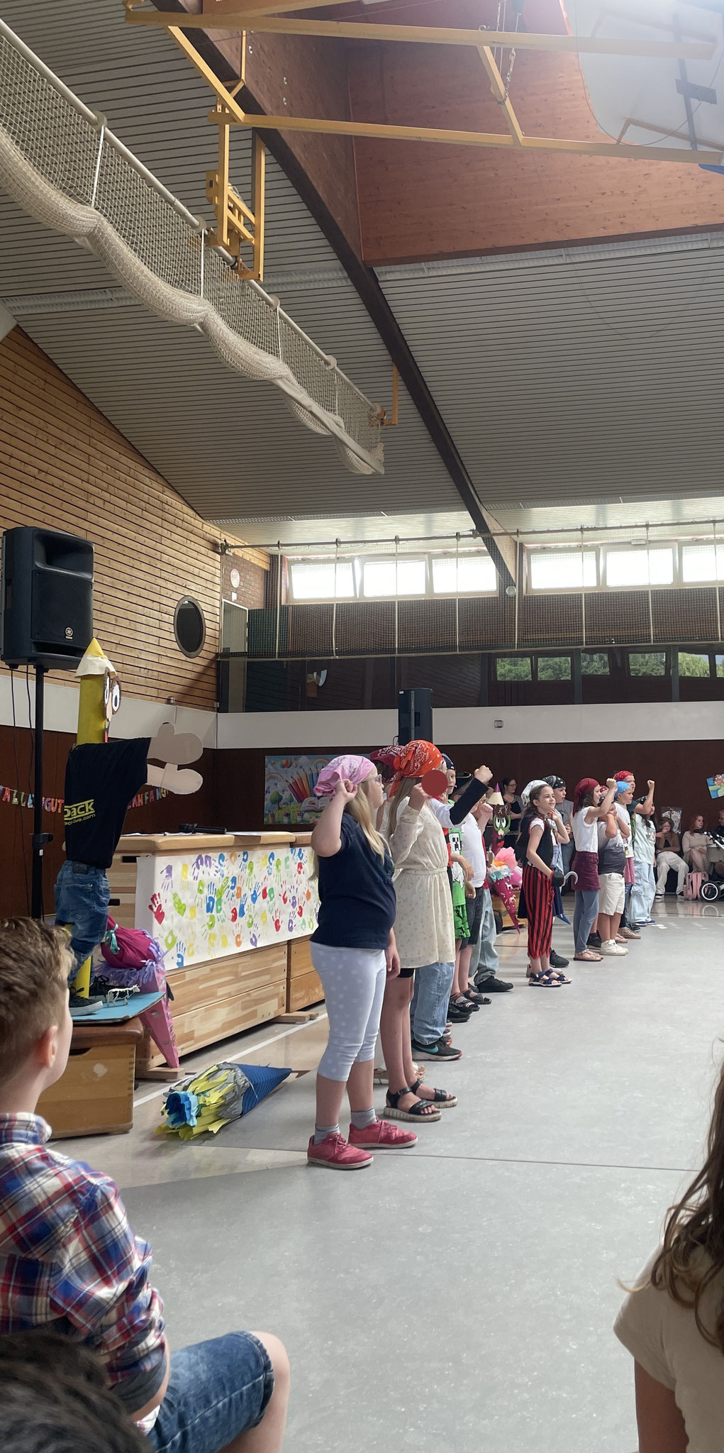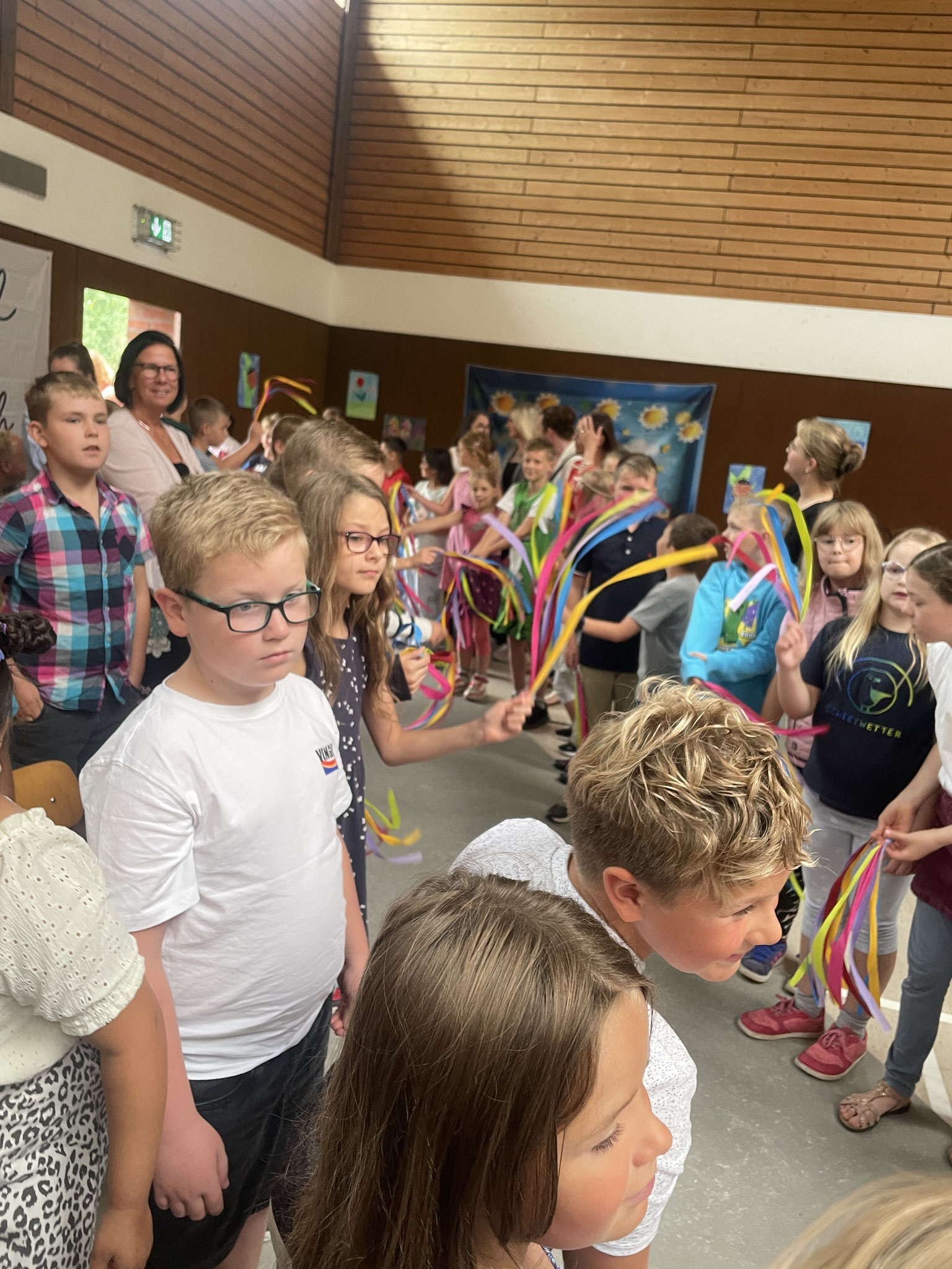Das Schuljahr 23/24 geht zu Ende. Für die Kornblumen- und Schlüsselblumenklasse hieß es: Abschied nehmen. Sie haben viele Jahre an unserer Grundschule verbracht und werden nun an eine weiterführende Schule gehen. Wir haben es uns aber nicht nehmen lassen, die Großen nochmal feierlich zu verabschieden! Alle Klassen kamen am Standort Uthwerdum zusammen. Auch die Eltern der Viertklässler waren eingeladen. Frau Lübbers führte durch unser buntes Programm: Es gab einige musikalische Beiträge, Sketche wurden aufgeführt und über Erlebnisse der vergangengen Jahre gesprochen. Zudem waren Frau Herresthal (Pastorin der Kirche Engerhafe) und Frau Düring-Hoogstraat (Pastorin der Kirche Victorbur) zu Gast und gaben den Kindern ein paar Weisheiten und gute Wünsche mit auf den Weg. Zum Abschluss stellten sich alle in einem Spalier auf und 'schmissen' die Viertklässler mit tosendem Beifall und Gejubel aus der Schule "raus"!